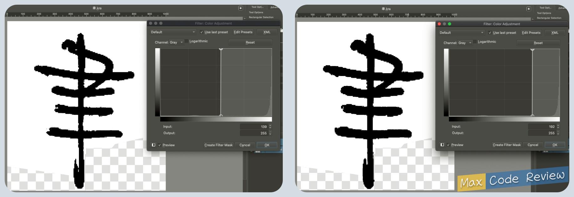 - 同一筆畫,有時下筆的開頭的顏色較淺,在調高對比值(二極化)之後,預期應該保留的筆畫就消失了。
